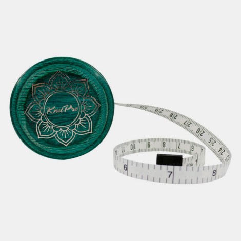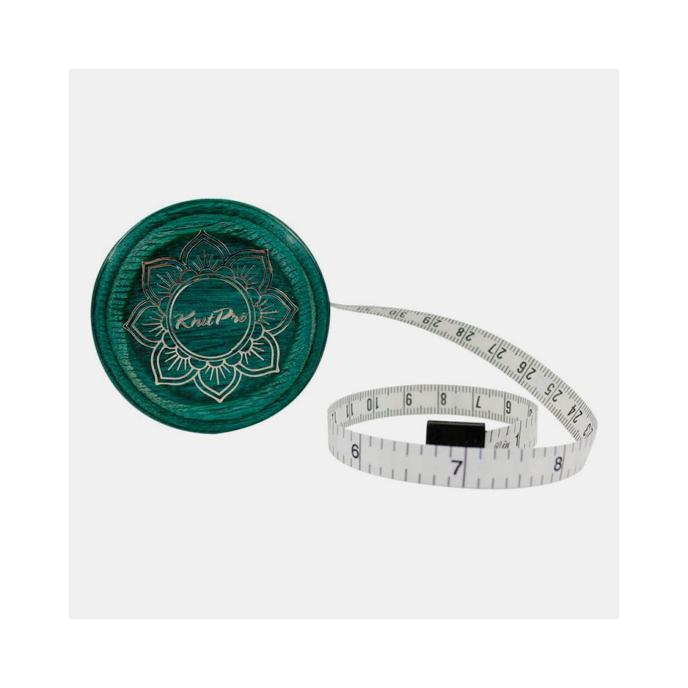 La cinta métrica con caja de madera de color verde azulado es el complemento ideal para las agujas y accesorios de la COLECCIÓN MINDFUL. El soberbio diseño de una flor de loto en la parte delantera es un recordatorio de la belleza de la colección. La cinta métrica interior de 152 cm/US60" se retrae suavemente pulsando el botón central.