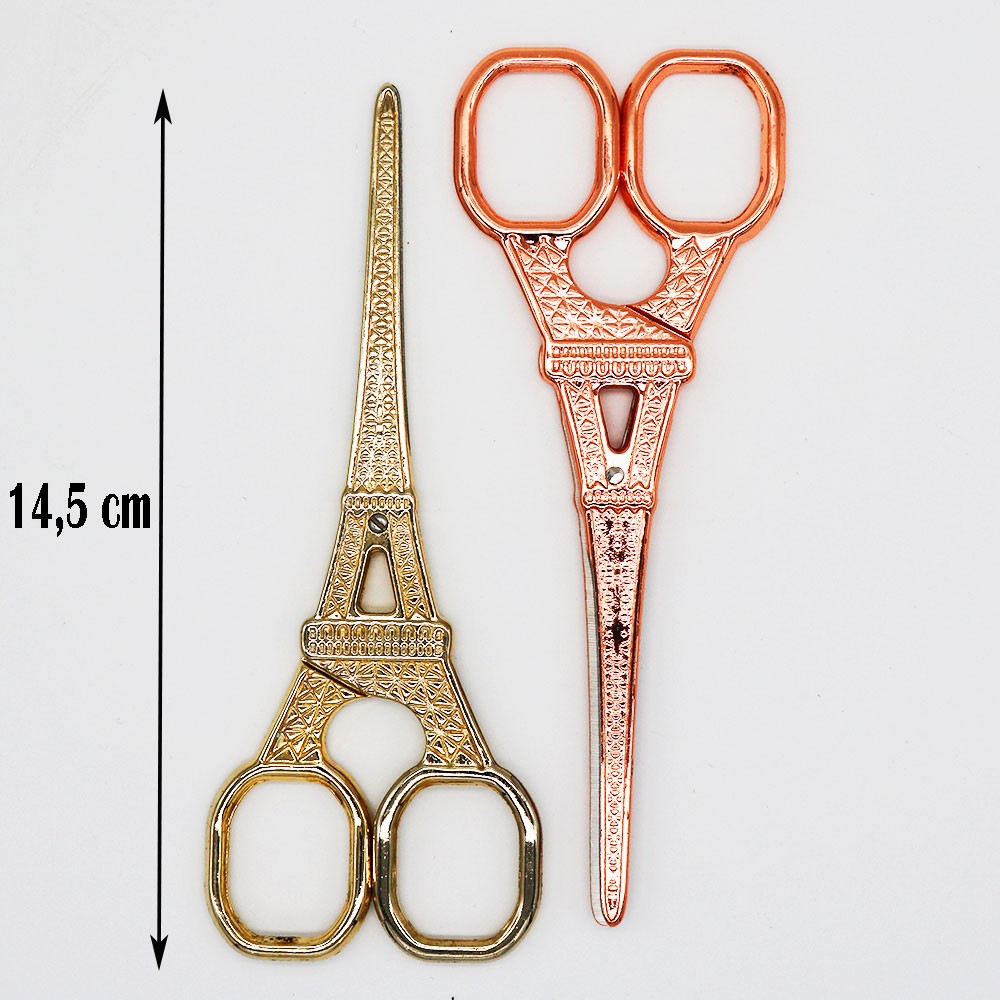 El diseño en forma de Torre Eiffel añade un elemento decorativo único a estas tijeras, mientras que los colores oro y bronce les otorgan un toque de elegancia. Estas tijeras no solo son una herramienta esencial, sino también un accesorio que realza tu experiencia de creación.